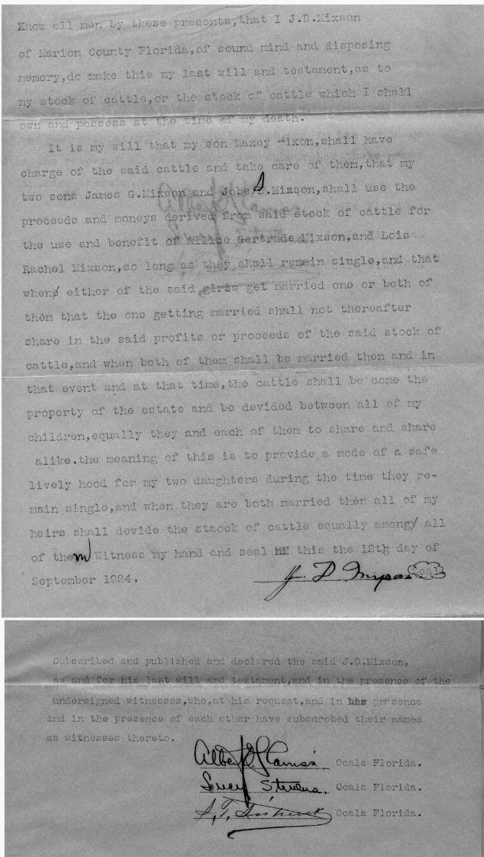 Below is the last will and testament of James Darlington Mixson (at least as pertaining to disposition of cattle and care of Aunt Alice and Aunt Lois). I read it: "... Know all men by these presents,that I J.D.Mixson of Marion County, Florida, of sound mind and disposing memory,do make this my last will and testament,as to my stock of cattle,or the stock of cattle which I shall own and possess at the time of my death. It is my will that my son Maxey Mixon (sic),shall have charge of the said cattle and take care of them,that my two sons James G.Mixson and Jobe (sic) S.Mixson,shall use the proceds (sic) and moneys derived from said stock of cattle for the use and benefit of Allice (sic) Gertrude Mixson, and Lois Rachel Mixson,so long as they shall remain single and that when(e) either of said girls get married one or both of them that the one getting married shall not thereafter share in the said profits or proceeds of the said stock of cattle, and when both of them shall be married then and in that event and at that time,the cattle shall be come the property of the estate and be devided (sic) between all of my children,equally they and each of them to share and share alike,the meaning of this is to provide a mode of a safe lively hood (sic) for my two daughters during the time they re- main single,and when they are both married than all of my heirs shall devide the staock (sic) of cattle equally among all of the(m) Witness my hand and seal xx this 12th day of September 1924. J. D. Mixson Seal |